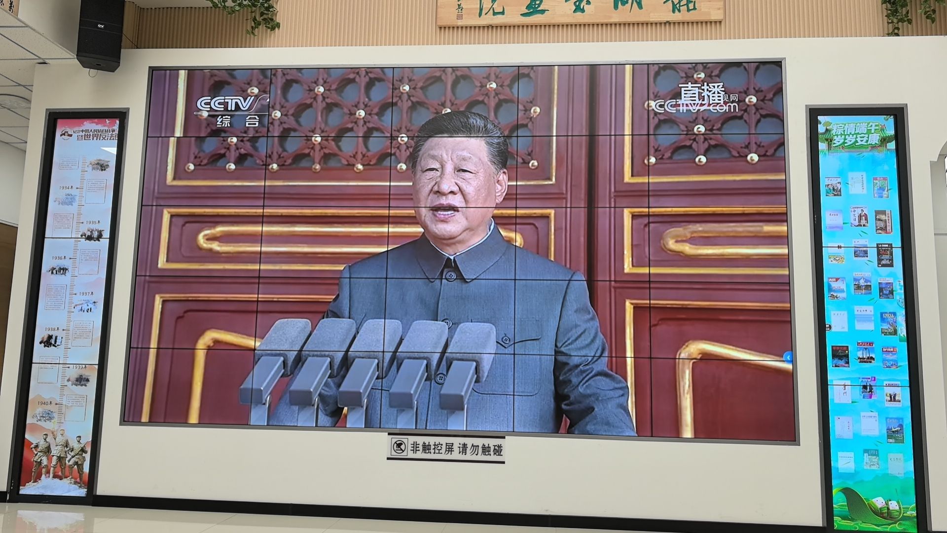 9月3日上午9时,中国人民抗日战争暨世界反法西斯战争胜利80周年纪念大会隆重举行,图书馆组织全体馆员和学生们在一楼大厅集中观看阅兵仪式直播,共同见证这一重要历史时刻。